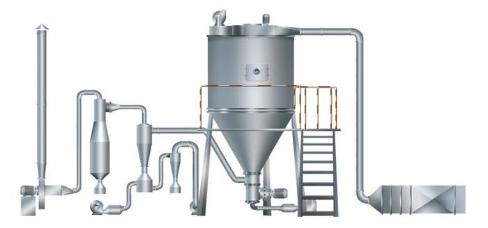 空氣經過濾和加熱,進入干燥器頂部空氣分配器,熱空氣呈螺旋狀均勻地進入干燥室。料液經塔體頂部的高速離心霧化器,(旋轉)噴霧成極細微的霧狀液珠,與熱空氣并流接觸在極短的時間內可干燥為成品。成品連續地由干燥塔底部和旋風分離器中輸出,廢氣由風機排空。