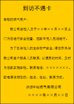 該貼原文為:“下班回家,見門上有一張與其他彩頁(yè)廣告不一樣的紙牌,看后方知是濟(jì)源中裕燃?xì)夤镜陌矙z人員特意留下的到訪不遇卡。卡的大致內(nèi)容是尊敬的天然氣用戶,我公司安檢人員于某時(shí)間到您家中進(jìn)行安全檢查,因家中無(wú)人無(wú)法進(jìn)行。為了您和他人的生命財(cái)產(chǎn)安全,請(qǐng)您盡快與我公司客戶中心聯(lián)系,以便另約時(shí)間。聯(lián)系電話……小小一片卡,反映出一個(gè)行業(yè)的工作作風(fēng),小小一片卡,大大拉近了供求之間的距離,小小一片卡,異常暖人心。”